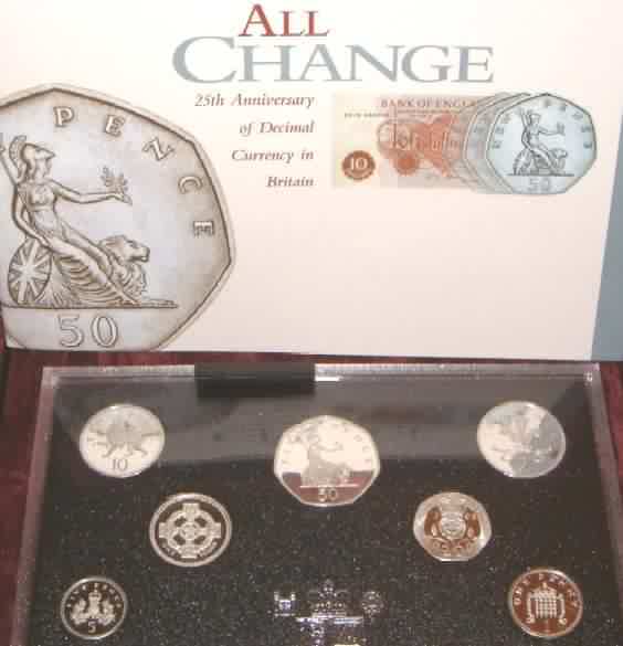 | 1996 25th Anniversary Collection 25th of Decimalization. 1 Pound Celtic Cross for Northern Ireland,50 pence,20 pence,10 pence,5 pence,2 pence,1 pence. All Sterling Silver. In Royal Mint box of issue with Booklet & COA very minor toning |