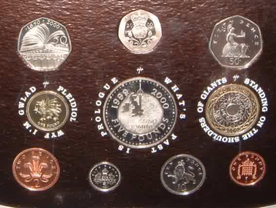 2000 Millennium Mint Set (Uncirculated) £2 Bi-Metal coin, £1 Welsh Dragon, 50p standard issue, 50p 150th Anniversary of Public Libraries, 20p,10p,5p,2p,1p. In official issue foldout flat pack (Blister Pack) |