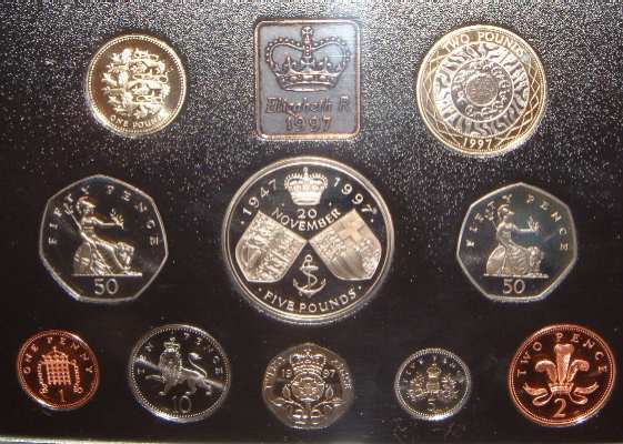 | 1997 Proof Set (Currency). £5 40th Wedding Anniversary of Queen Elizabeth II, £2 Bi-Metal,£1 Three Lions for England, Old large 50p, New smaller size 50p, 20,10,5,2 and 1 Pence coins. In blue case of issue. Very minor toning |